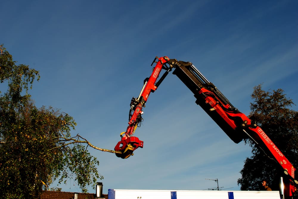 Bei besonders hohen oder gefährlichen Bäumen – z. B. mit Pilzbefall oder Bruchgefahr – kann ich per Autokran große Stammstücke kontrolliert abheben und verladen. Effizient, sicher und eindrucksvoll.